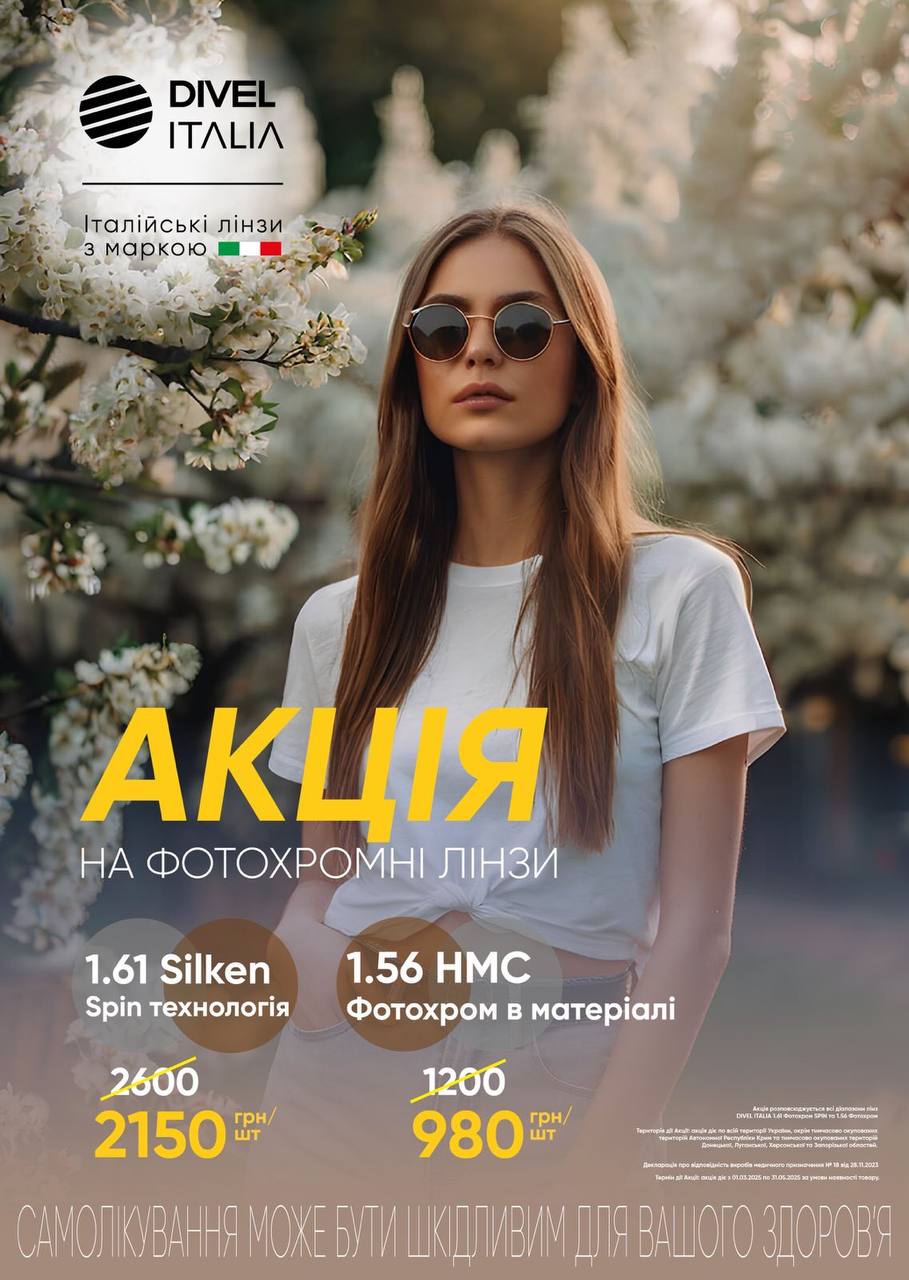 Лінзи Divel Italia 1.61 Silken (технологія Spin) - має фотохром в покритті, що робить її підходящою для будь-якої оправи. Ці лінзи забезпечують рівномірне затемнення по передній поверхні, незалежно від діоптрії, астигматика до -2,00Д. І також доступні в кольорах сірого та коричневого.